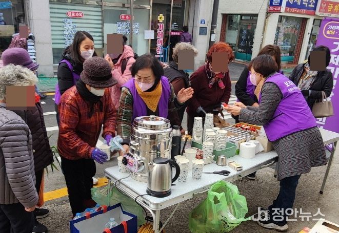 상담센터 관계자들은 장터를 찾은 시민들과 상인들에게 따뜻한 차를 나누며 자연스럽게 여성폭력 예방 메시지를 전달했다.