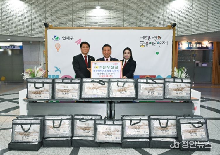 정안뉴스 황정혜 기자 | 연제구는 11월 24일 ㈜천우산전(대표 김두석)으로부터 지역 내 저소득 중장년층 1인 가구 지원을 위한 전기매트 33개(100만 원 상당)를 전달받았다.