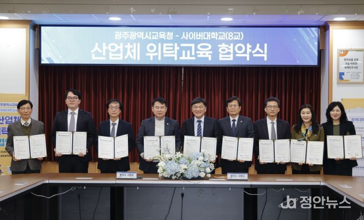 시교육청은 27일 중회의실에서 이정선 교육감, 국제사이버대학교 홍승정 총장, 서울사이버대학교 이은주 총장, 원광디지털대학교 김윤철 총장, 사이버한국외국어대학교 김병철 총장 직무대행, 한양사이버대학교 정현철 부총장, 경희사이버대학교 신봉섭 부총장, 건양사이버대학교 이진경 입학홍보처장, 고려사이버대학교 백창현 입학처장 등이 참석한 가운데 ‘산업체 위탁교육 업무협약’을 체결했다.