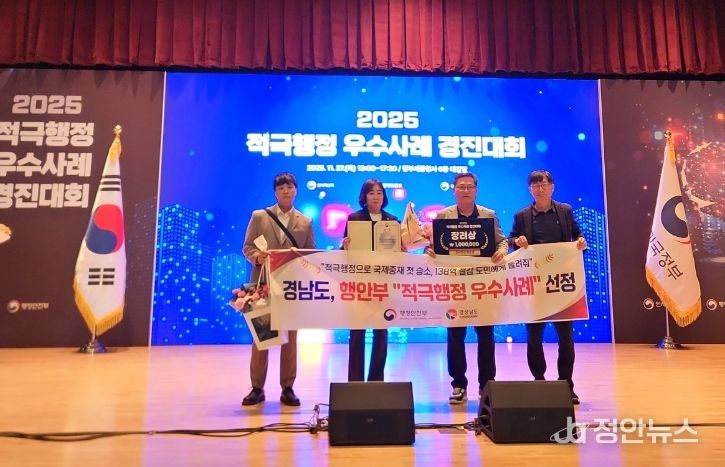 정안뉴스 김재홍 기자 | 경남도가 지난 27일 열린 행정안전부 ‘2025년 적극행정 우수사례 경진대회’에서 ‘적극행정으로 국제중재 첫 승소, 138억 절감 도민에게 돌려줘’ 사례로 기관 표창(인사혁신처장상)을 받았다고 28일 밝혔다.