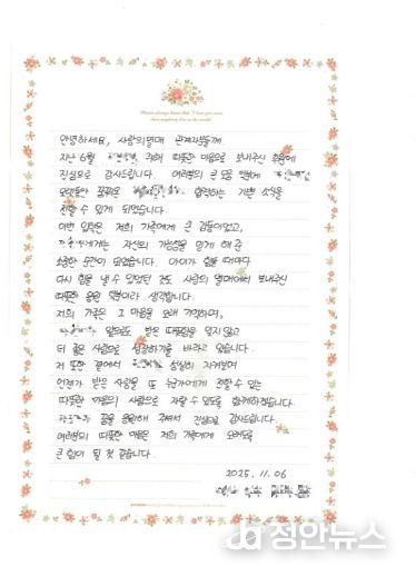 감사의 편지를 보낸 이는 지난 5월 1일 지역 언론사를 통해 사연을 공개한 희정씨! 희정 씨는 관내 한 저소득 가정의 어머니로, 평소 경제적 어려움으로 자녀 교육비 마련에 큰 부담을 겪어 왔다. 그러나 동구가 사랑의 열매와 함께 추진한 '사랑의 징검다리' 후원금 모금 지원사업을 통해 교육비 부담이 덜어지면서,