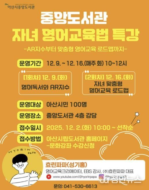 정안뉴스 황도연 기자 | 아산시 중앙도서관은 오는 12월 9일과 16일, 두 차례에 걸쳐 영어교육 전문가 효린파파(성기홍)와 함께하는 자녀 영어교육법 특강을 운영한다.