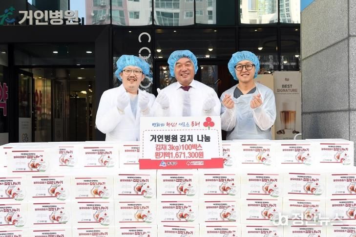 동래구 사직동에 위치한 거인병원은 매년 11월 말 김장김치 나눔 행사를 이어오고 있으며, 임직원들이 직접 배추를 선별부터 절임, 양념, 포장까지 담당하고 있다.