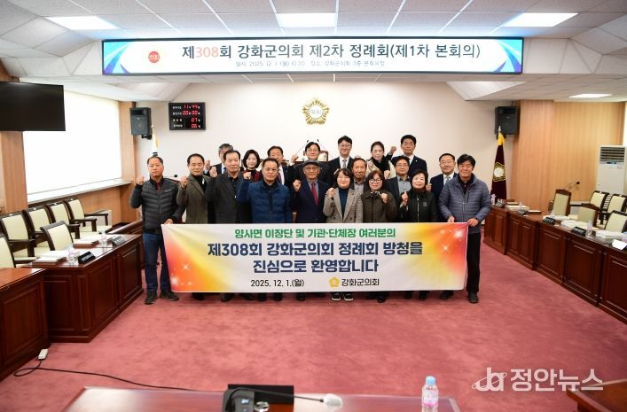 정안뉴스 안정주 기자 | 강화군의회는 1일 제308회 제2차 정례회 본회의에 강화군 양사면 이장단 및 주요 기관·단체장이 참석해 방청을 진행했다고 밝혔다.