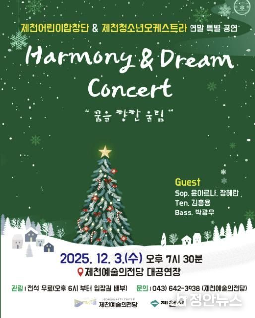 정안뉴스 황은경 기자 | 제천예술의전당은 오는 12월 3일 오후 7시 30분, 지역을 대표하는 예술 꿈나무인 제천어린이합창단과 제천청소년오케스트라가 처음으로 함께 꾸미는 기획공연 'Harmony & Dream Concert(하모니 & 드림 콘서트) – ‘꿈을 향한 울림’'을 대공연장에서 선보인다.