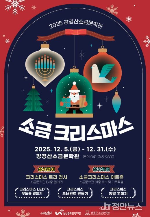 정안뉴스 황도연 기자 | (재)논산문화관광재단이 주관하는 강경산 소금문학관이 크리스마스를 앞두고 관람객들에게 따뜻한 연말 분위기를 선사할 크리스마스 트리 전시와 특별 문화예술 프로그램을 선보인다.