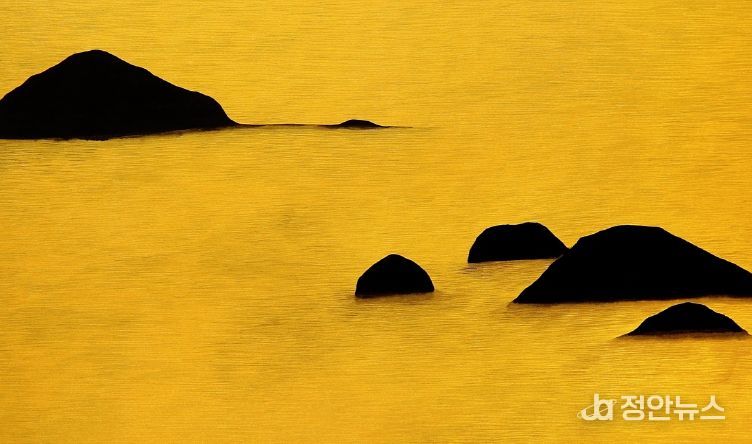 이번 전시의 주요 작품인 ‘스미는 고요’는 금빛 물을 그린 듯 보이지만 사실은 검은 물과 검은 섬의 세계를 품고 있다.