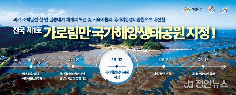 정안뉴스 황도연 기자 | 충남도는 세계 5대 갯벌이자 전국 최초·최대 해양생물보호구역인 가로림만이 ‘제1호 국가해양생태공원’으로 지정됐다고 2일 밝혔다.