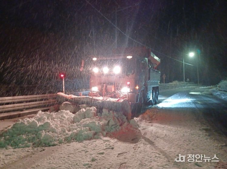 군은 덤프 7대, 굴삭기 1대 제설기 7대 살포기 7대 등을 활용해 24시간 대응체계를 구축했으며, 제설 자재 소금 683톤과 염화칼슘 293톤을 사전 확보했다.