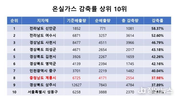 정안뉴스 황도연 기자 | 계룡시는 공공부문 온실가스 감축률 평가에서 전국 243개 지방자치단체 중 8위를 기록해 충청남도 내 유일하게 ‘상위 10개 기관’에 선정됐다고 11일 밝혔다.