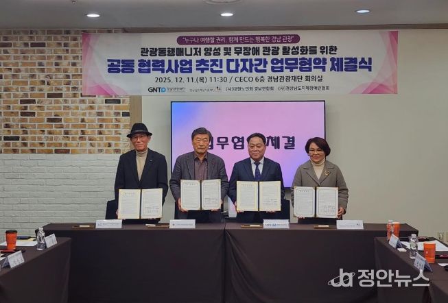 정안뉴스 김재홍 기자 | 경상남도관광재단은 11일 오전 12시 창원컨벤션센터에서 경상남도가족센터, 대한노인회 경남연합회, 경상남도지체장애인협회와 무장애 관광 활성화를 위한 다자간 업무협약을 체결했다고 밝혔다.