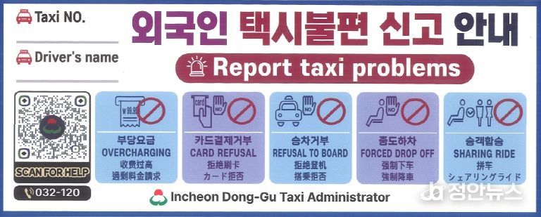 정안뉴스 안정주 기자 | 인천 동구는 외국인 관광객을 대상으로 한 불법 택시 영업을 근절하고 이용 편의를 높이기 위해‘불편 신고 QR스티커’를 택시에 부착한다고 밝혔다.