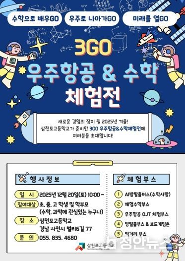 정안뉴스 김재홍 기자 | 삼천포고등학교는 오는 12월 20일 오전 10시부터 교내에서 ‘3GO 우주항공&수학 체험전’을 개최한다.