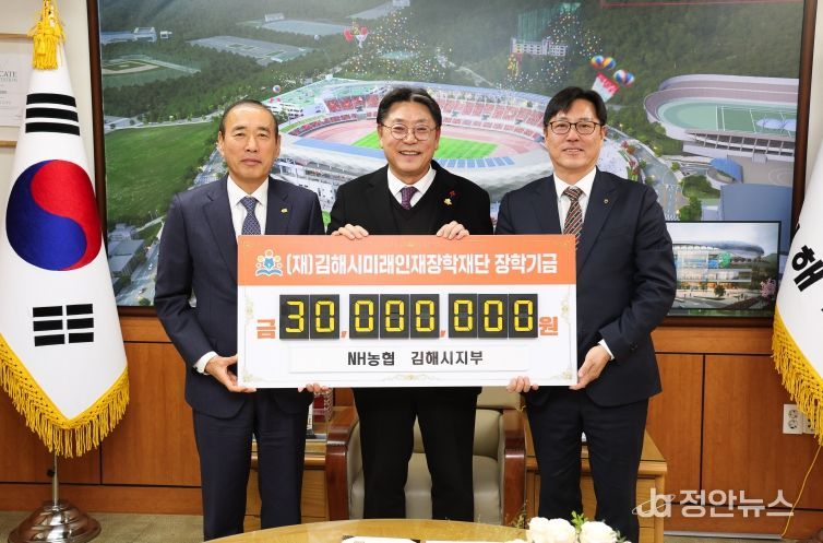 정안뉴스 김재홍 기자 | 김해시미래인재장학재단(이사장 노은식)은 15일 농협 김해시지부에서 장학기금 3,000만원을 기탁했다고 밝혔다.