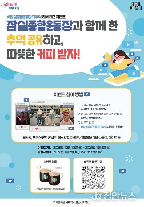 정안뉴스 안정주 기자 | 서울시 체육시설관리사업소는 잠실종합운동장에서 시민이 경험한 다양한 추억과 기억을 수집하기 위한 SNS 이벤트 '#잠실종합운동장의 추억 해시태그 이벤트'를 2026년 1월 5일까지 진행한다고 밝혔다.