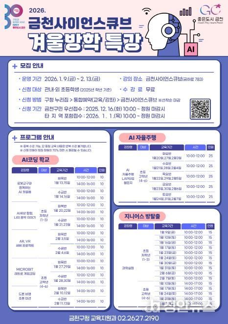 유성훈 금천구청장은 "지난 겨울방학 특강에 대한 높은 호응에 힘입어 올해도 더욱 알찬 프로그램을 준비했다“라며, "아이들이 AI 자율주행차를 직접 코딩하고, 과학 방탈출 미션을 해결하며 자연스럽게 문제해결력을 키울 수 있을 것"이라고 말했다.