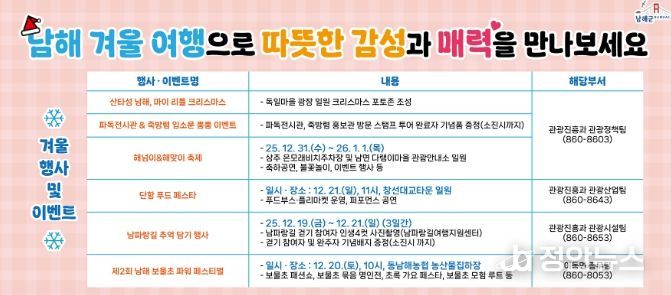 정안뉴스 김재홍 기자 | 남해군은 겨울 여행 관광객 유치와 체류형 관광 활성화를 위하여 다양한 매력적인 행사 ․ 이벤트를 개최한다.