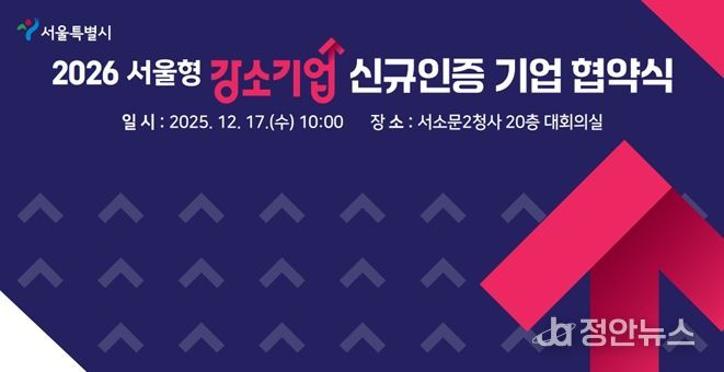 서울시는 지난 9월 ‘2026년 서울형 강소기업’으로 신규 인증한 48개사와 청년 정규직 채용 확대 및 일·생활 균형이 가능한 근무환경 조성을 약속하는 '2026년 서울형 강소기업 신규 인증 협약식'을 12월 17일(수) 서울시청 서소문2청사에서 개최했다고 밝혔다.