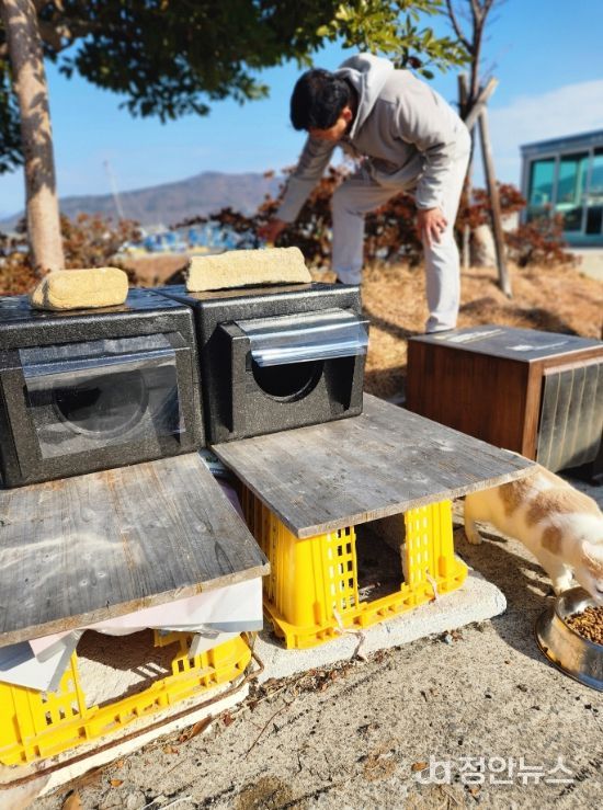 정안뉴스 김재홍 기자 | 통영시는 지난 16일 통영 고양이섬 용호도에 겨울철 한파로부터 길고양이를 보호하고, 고양이와 주민이 공존하는 환경을 조성하기 위해 고양이섬 추진위원회(위원장 정경섭)와 마을주민들이 협업해‘고양이 겨울집’을 설치했다.