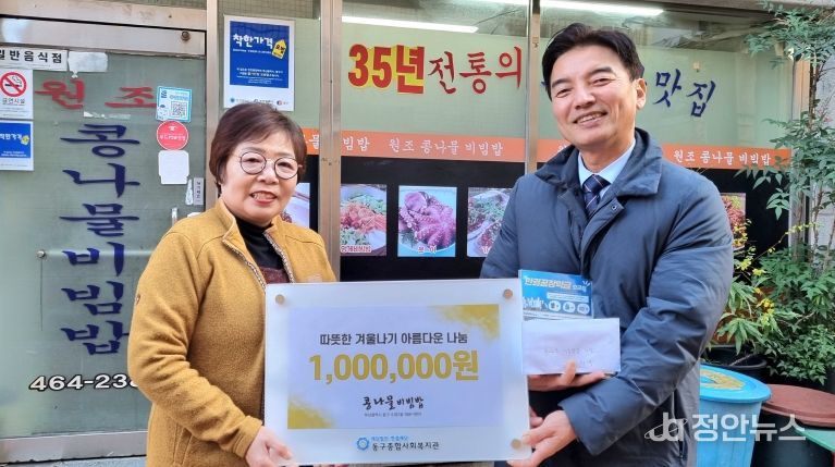 정안뉴스 황정혜 기자 | 부산 동구종합사회복지관(관장 김창근)은 지난 15일 부산 동구 수정동에 위치한 식당 원조콩나물비빔밥(이희숙 대표)에서 성금 100만원을 후원했다고 밝혔다.