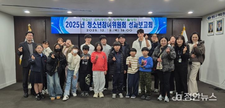 정안뉴스 황정혜 기자 | 부산 영도구는 지난 12월 18일 영도구청에서 청소년과 보호자 20여 명이 참석한 가운데 ‘제13기 영도구 청소년참여위원회 성과보고회’를 개최하고, 위원회의 한 해 활동을 공식적으로 마무리했다.
