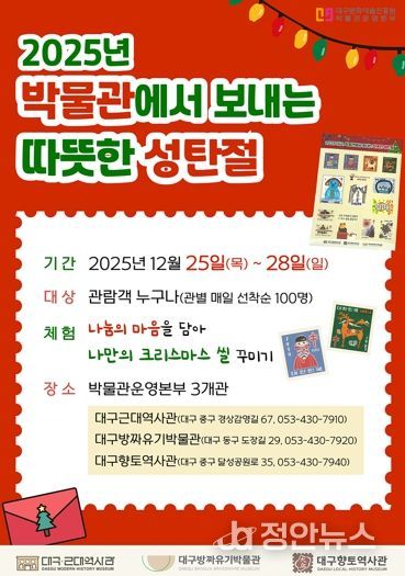 정안뉴스 안정주 기자 | 대구문화예술진흥원 박물관운영본부 소속 대구 시립 3개 박물관(대구근대역사관·대구방짜유기박물관·대구향토역사관)에서는 성탄절을 맞아, 12월 25일부터 28일까지 관람객을 대상으로 ‘2025년 박물관에서 보내는 따뜻한 성탄절 –나만의 크리스마스 씰 꾸미기-’ 문화행사를 진행한다.