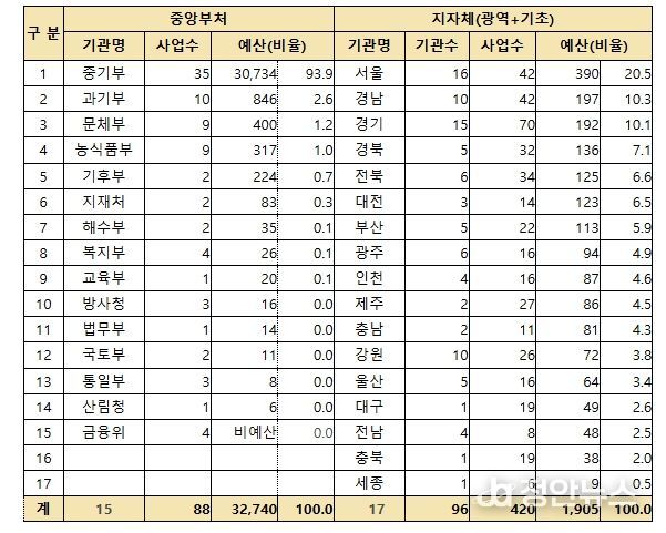 지방자치단체(광역 17개, 기초 79개)는 서울(390억원), 경남(197억원), 경기(192억원) 등에서 총 1,905억원, 420개 사업을 추진할 계획이다.