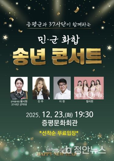 정안뉴스 황은경 기자 | 충북 증평군은 오는 12월 23일 오후 7시 30분, 증평문화회관에서 민과 군(軍이) 함께 어우러지는‘민·군화합 송년콘서트’를 개최한다.
