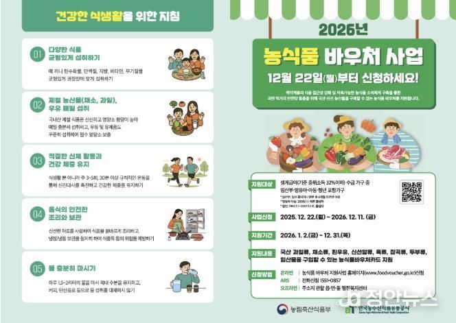정안뉴스 안정주 기자 | 서울 서초구는 취약계층의 식품 접근성을 높이고 안정적인 식생활을 지원하기 위해 12월 22일부터 ‘2026년 농식품바우처 사업’ 신청자를 모집한다고 밝혔다.