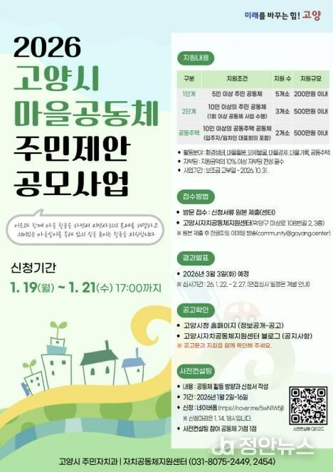 정안뉴스 안정주 기자 | 고양특례시는 이웃과 함께 마을 활동에 참여하며 주민 스스로 지역 문제를 해결해 나가는 ‘2026년 고양시 마을공동체 주민제안 공모사업’에 참여할 공동체를 내년 1월 19일부터 모집한다고 밝혔다.