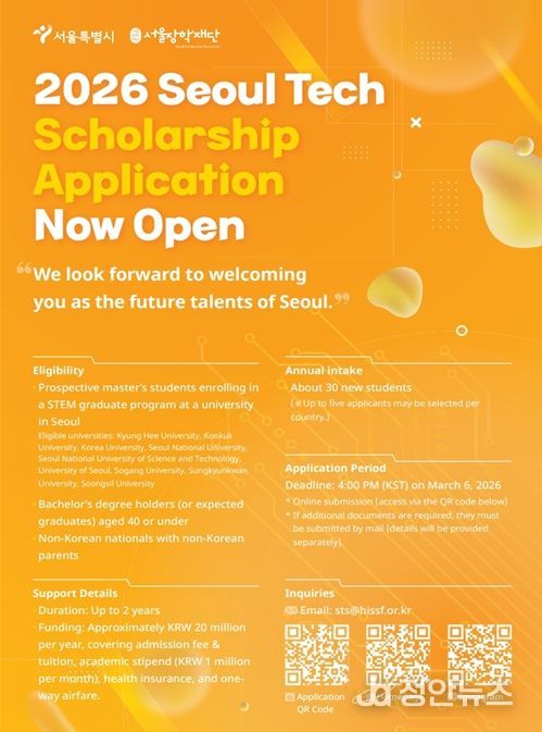 정안뉴스 안정주 기자 | 서울장학재단이 기존 개발도상국 중심이던 지원 자격을 국적 제한 없이 전면 개방하고, '2026년 서울테크스칼러십(Seoul Tech Scholarship)' 장학생 30명을 선발한다. 서울의 미래 산업을 이끌 글로벌 이공계 우수 인재를 서울로 적극 유치하기 위한 전략이다.