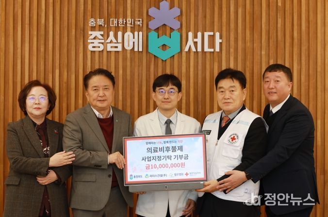 정안뉴스 안정주 기자 | 충북도는 22일 도청 여는마당에서 첼로병원, 리더스건설(주) 등이 ‘의료비후불제 치아교정 특례지원금’ 사업 기부를 희망하는 16개 업체를 대표하여 대한적십자사 충북지사에 1천만 원을 지정 기탁했다고 밝혔다.