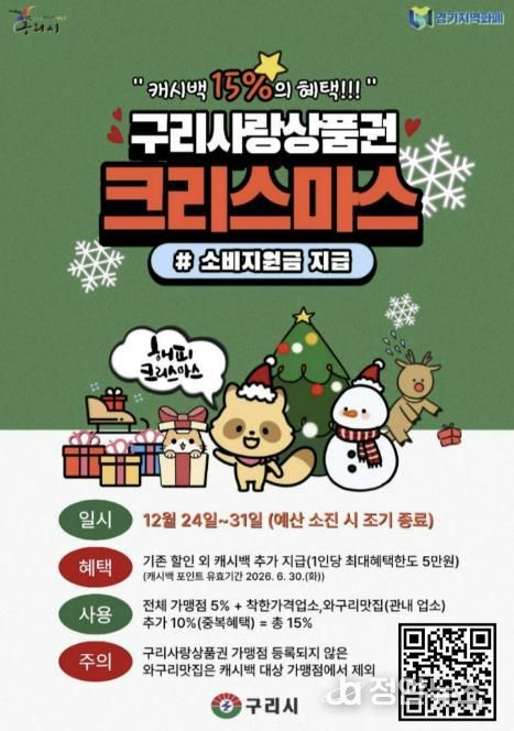 정안뉴스 안정주 기자 | 구리시는 12월 24일부터 ‘구리사랑상품권 크리스마스 소비 지원금’을 지급한다고 밝혔다. 이번 소비 지원금은 연말연시 기간 지역 외로 유출되는 소비를 지역 내로 유도하고, 관내 상권 활성화와 소상공인 보호를 위해 마련됐으며, 예산 소진 시 조기 종료될 수 있다.