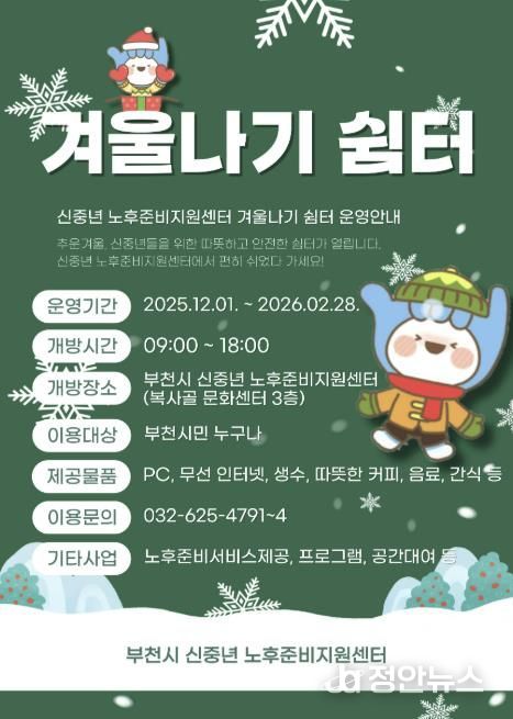 이소영 부천시 돌봄지원과장은 “겨울나기 쉼터는 시민들이 추위를 피해 따뜻하게 머물며 이웃과 자연스럽게 마주하고 소통할 수 있는 공간”이라며 “쉼터 이용이 노후준비 상담과 교육 등 다양한 서비스로 이어질 수 있도록 운영해 나가겠다”고 말했다.