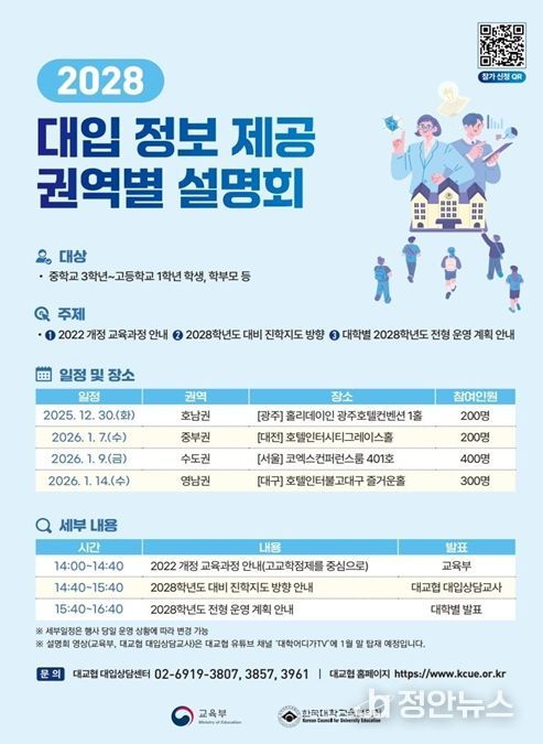 끝으로, 2028 대입 제도와 고교학점제 주요 내용, 2028학년도 대학별 모집단위‧입학전형 반영과목 등을 담은 정보 자료집도 제공한다. 해당 자료집은 12월 30일(화)부터 '2028 대입 정보 제공 권역별 설명회'와 대교협의 대입정보포털 ‘어디가’를 통해 배포할 예정이다.
