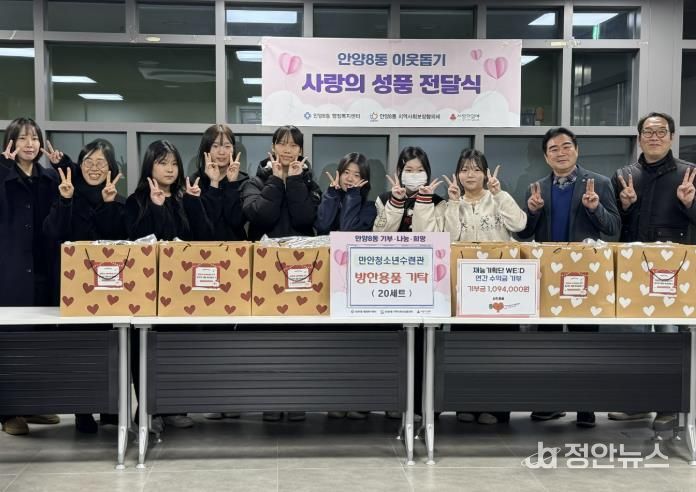 정안뉴스 안정주 기자 | 안양시 만안구 안양8동 행정복지센터에 따르면 지난 18일 만안청소년수련관의 청소년 자치활동 프로그램 ‘재능기획단’이 관내 혼자 생활하는 어르신들에게 전달해달라며 센터에 1,094,000원 상당의 방한용품 20세트를 기탁했다고 23일 밝혔다.