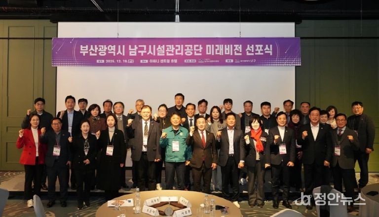 정안뉴스 황정혜 기자 | 부산 남구시설관리공단은 지난 12월 19일, 부산 남구 아바니 센트럴 호텔에서 ‘미래 비전 선포식’을 개최했다고 밝혔다. 이번 행사는 공단 출범 3년을 맞아 처음으로 열린 비전 선포 행사로, 행정안전부 지방공기업 경영평가 개선 과제로 제시된 중장기 경영전략 수립과 이행을 본격화하는 출발점으로 마련됐다.