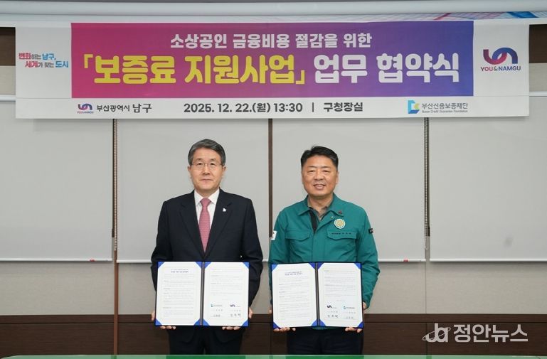 정안뉴스 황정혜 기자 | 부산 남구는 부산신용보증재단(이사장 성동화)과 지난 12월 22일 남구청에서 소상공인 경영 안정과 민생경제 활성화를 위한 '남구 소상공인 보증료 지원사업 업무협약'을 체결했다고 밝혔다.