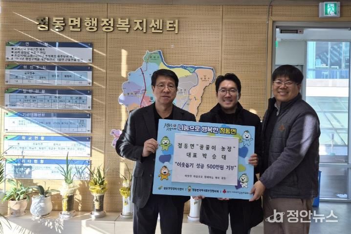 정안뉴스 안정주 기자 | 점동면 관내 꿀꿀이 농장 박승대 대표가 지난 12월 22일, 연말을 맞아 이웃사랑 성금 500만원을 경기사회복지공동모금회를 통해 점동면 지정기탁으로 점동면행정복지센터에 전달하며 지역사회에 따뜻한 감동을 전했다.