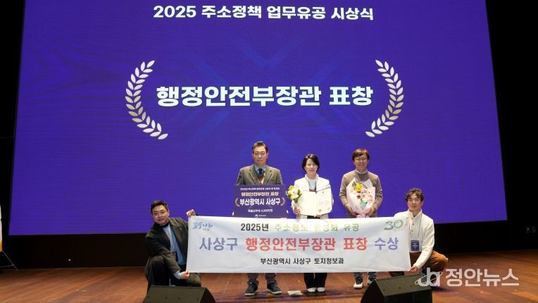 정안뉴스 황정혜 기자 | 부산 사상구는 지난 18일 행정안전부 주관 ‘2025년 주소정책 성과공유 워크숍’에서 주소정보 업무평가 우수기관으로 선정돼 행정안전부 장관 표창을 수상하고, 특별교부세 4천만 원을 확보했다고 밝혔다.