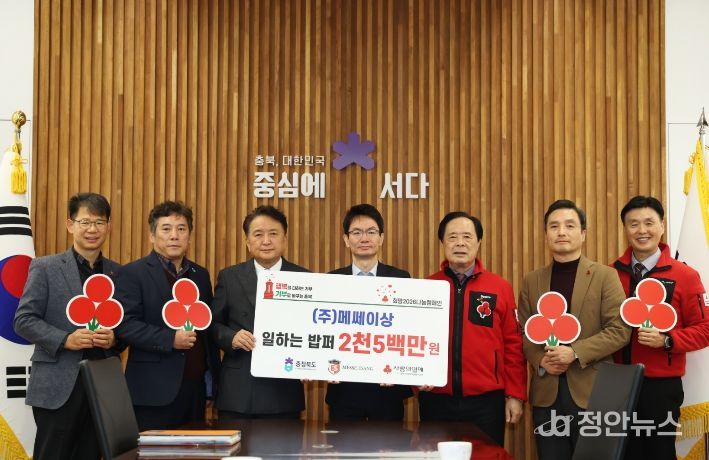 정안뉴스 황은경 기자 | 충북도는 24일 도청 여는마당에서 청주오스코 민간위탁 운영사인 ㈜메쎄이상이‘일하는 밥퍼’지원을 위해 2천5백만원을 기탁했다고 밝혔다.