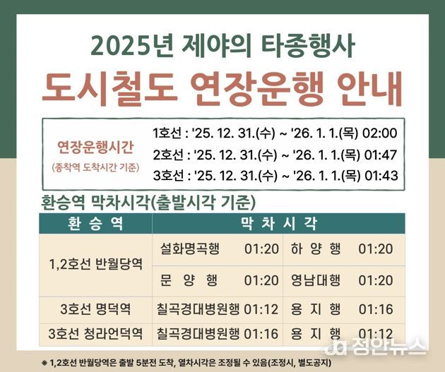 한편, 행사 당일 밤 10시 30분부터 다음날 01시 30까지 동인네거리~삼덕네거리, 공평네거리~동신교 서편 구간이 전면 통제된다. 행사장 인근을 통과하는 시내버스 18개 노선*은 밤 10시 30분 이후 행사장을 우회 운행하고, 직행 1개 노선과 급행 4개 노선**은 새벽 1시경 시내를 통과한다. 도시철도는 반월당역과 명덕역을 다음날 01시 10분경 통과하도록 연장 운행해 시민들의 안전한 귀가를 도울 계획이다.