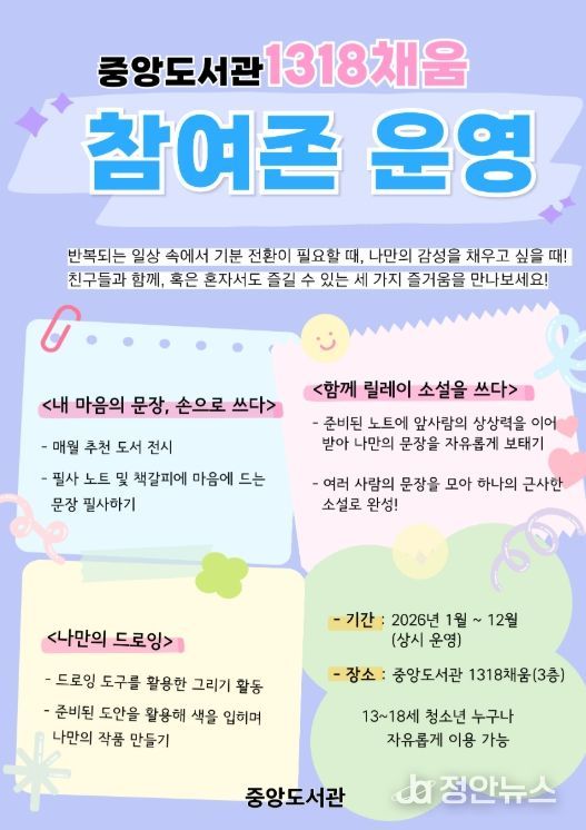 정안뉴스 황도연 기자 | 천안시 중앙도서관은 내년부터 ‘1318채움 청소년 놀이터’를 운영한다고 26일 밝혔다.
