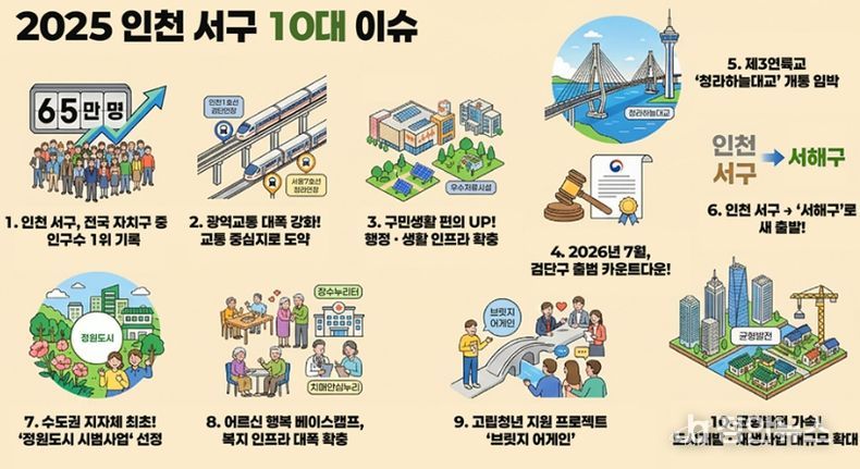 정안뉴스 안정주 기자 | 인천광역시 서구에서는 2025년 한 해 동안 주요 관심 사항과 정책 추진 상황 등을 정리하여 2025 인천 서구 10대 이슈를 선정·발표했다.