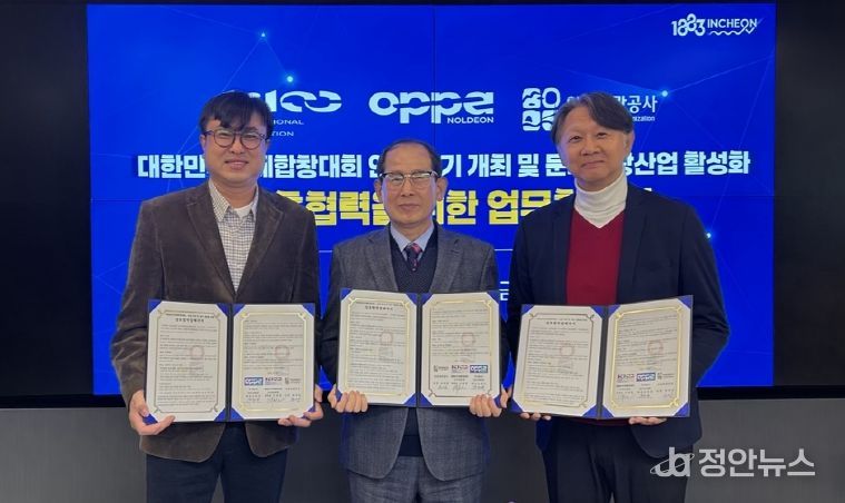 정안뉴스 안정주 기자 | 인천관광공사(사장 유지상)와 대한민국국제합창대회 조직위원회(위원장 김희철), ㈜놀던오빠들(대표 김준호)은 26일 인천관광공사에서 ‘대한민국국제합창대회 인천 개최(2026년~2030년) 및 문화관광 활성화’를 위한 업무협약을 체결했다.