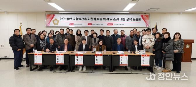 정안뉴스 안정주 기자 | 안양시의회 김경숙 의원(국민의힘, 석수1·2동·충훈동)은 12월 24일 시의회 소회의실에서 '만안·동안 균형발전을 위한 용적률 특례 및 조례 개정 정책토론회'를 개최하고, 만안과 동안 간 개발 격차 해소를 위한 다양한 정책 대안을 논의했다.