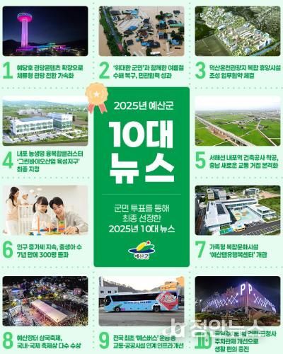 정안뉴스 황도연 기자 | 예산군은 2025년 한 해 동안 군정 전반에서 의미 있는 성과를 거둔 주요 정책과 사업을 담은 ‘2025년 올해의 군정 10대 뉴스’를 지난 10일부터 24일까지 진행한 군민 투표를 통해 최종 선정했다고 밝혔다.