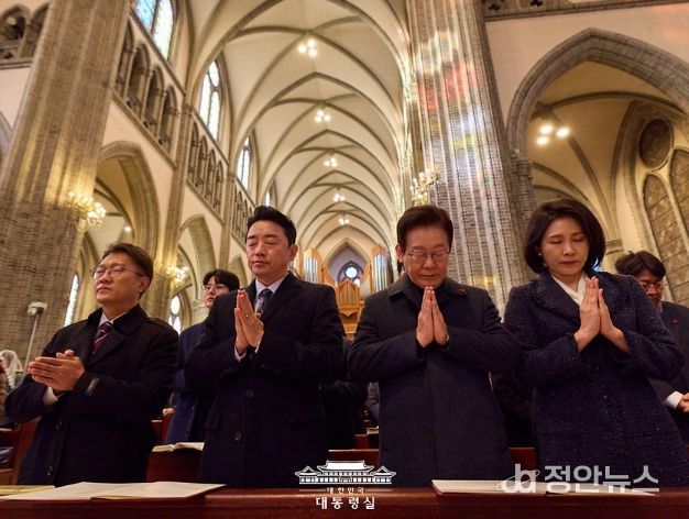 정안뉴스 안정주 기자 | 이재명 대통령과 김혜경 여사가 25일 서울 중구 명동대성당에서 열린 성탄 대축일 미사에서 기도를 하고 있다.