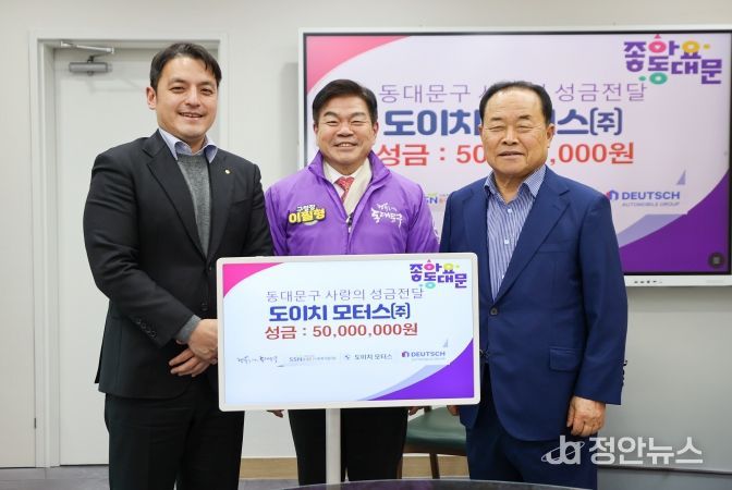 정안뉴스 안정주 기자 | 서울 동대문구는 도이치모터스로부터 사랑의 성금 5000만원을 전달받았다고 밝혔다. 도이치모터스가 2011년부터 올해까지 15년째 이어온 기부는 2011~2024년 누적 2억6500만원에 달하며, 올해도 5000만원을 보태 지역 나눔을 이어갔다.