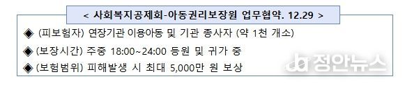 이번 야간 연장돌봄 사업에는 KB금융도 함께 참여한다. 복지부-KB금융 업무협약(’25.10.2.)을 통해 이번 사업 참여기관인 360개소를 포함한 전국 1천여 개 마을돌봄시설의 야간 시간대 이용아동과 종사자들의 안전을 함께 책임진다. 29일에는 사회복지공제회와 아동권리보장원이 업무협약을 맺어 연장기관 이용아동 및 기관 종사자를 대상으로 보험 가입 등을 지원할 예정이다.
